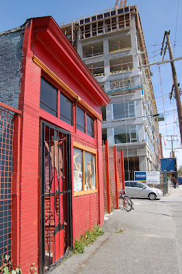 A Vancouver Jimi Hendrix connection? Although Jimi Hendrix was born in Seattle, Washington, in 1942, his father, Al Hendrix, grew up in Vancouver, and Jimi's grandmother, Nora Hendrix, continued to live here when Al moved to Seattle in 1940. As I was bicycling from the West End to the Winter Farmers' Market in East Vancouver yesterday (a return trip of about 15 km) I passed this odd little shrine to Jimi in the Strathcona neighbourhood, which was once home to Hogan's Alley, Vancouver's black neighbourhood and entertainment district before it was razed to make way for the Georgia St Viaduct. Although I haven't found anything definitive on the web, it seems that this building (or one next door which has since been torn down, depending who you're talking to) was once where Hendrix's grandmother either owned and operated a restaurant (Vie's Chicken and Steak House) or was simply a cook who worked there. Either way, it seems that young Jimi spent a lot of time with his grandmother, living with her some of the time, and used to practice guitar on the premises.
